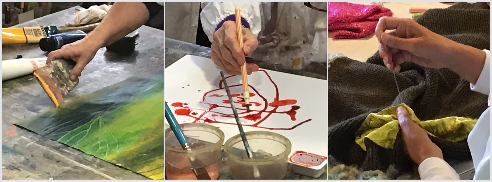 et profiter de l’instant, en choisissant simplement de revenir présent à sa propre vie, aux mouvements de son désir avec ces moyens d’expression dans les langages de la création pour improviser avec l’argile, la peinture, les tissus, les encres, les pastels, les crayons, les plumes, les papiers, les ciseaux, le bois, et tant d’autres choses et babioles qui remplissent les tiroirs et qui « nous tendent les bras » à l’Atelier (!)
