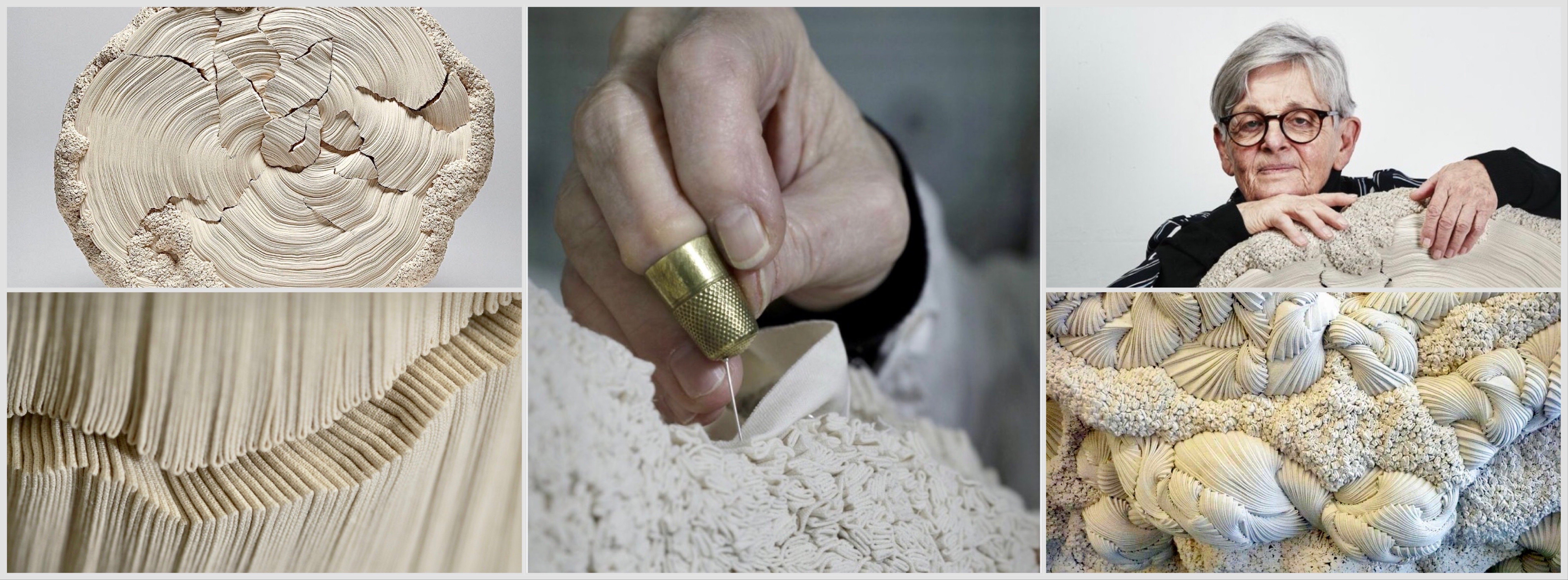 Les artistes en général utilisent une toile de lin tendue sur un cadre. Ce tissu est agrafé tendu rigide, embelli ou pas par des couleurs, Simone par contre le façonne, l’enroule, le plisse, le dorlote et lui donne la forme qui lui convient,