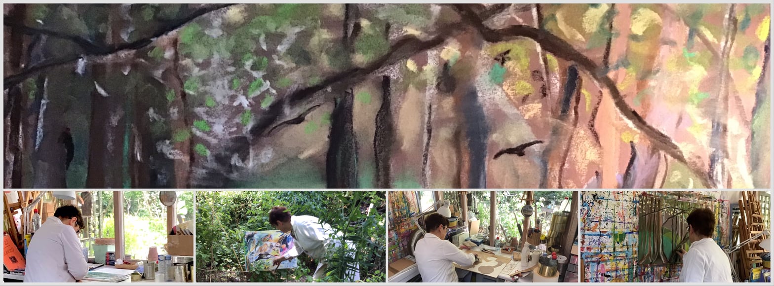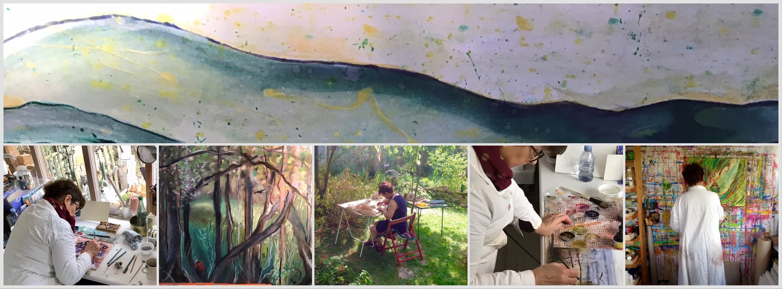 Chercher, s’abandonner, se laisser ensorceler par les couleurs, la magie de la trace d’un pinceau en éventail, de la tache faite par une éponge, d’un trait de crayon pastel, de la douceur d’une courbe aquarellée …