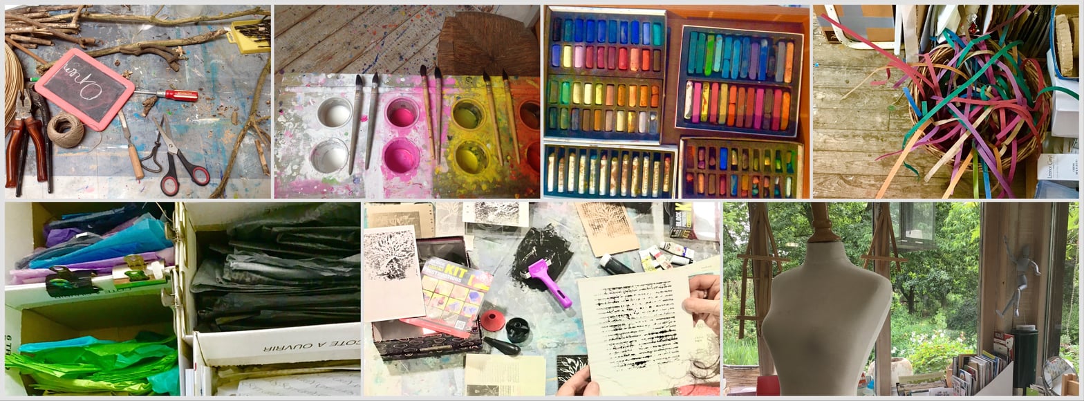 Un objet peut être prétexte, m’aider à créer. Parfois aucune idée ne vient pendant de longues minutes ; c’est le désert, l’impasse, la peur du vide, de la page blanche, puis, tout à coup une touche de couleur, alors tout s’illumine. Je me sens apaisée et confiante. Le processus de création est débloqué.