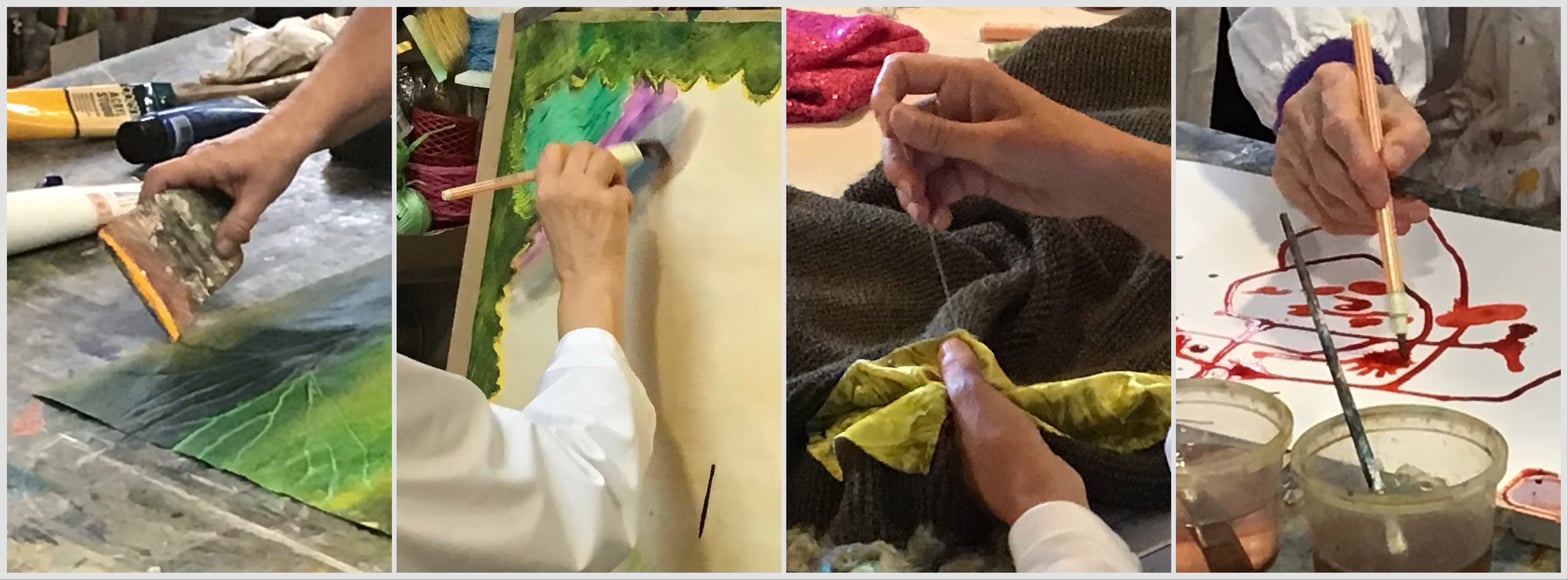 Peut-être à retrouver la sensation que nous éprouvons précisément en créant ? La sensation du crayon, sur le papier, du pinceau, du tissu, de l’argile entre nos mains…