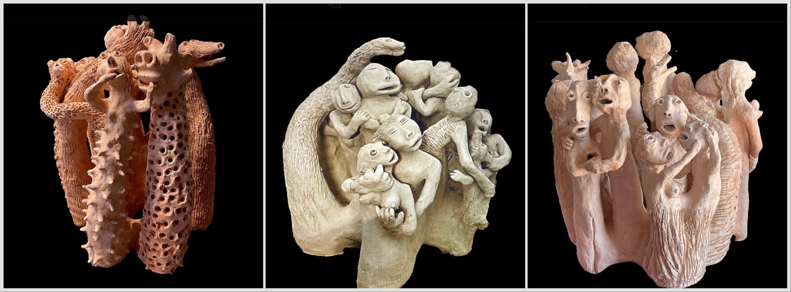Ses dernières oeuvres en céramique il y a peu sorties du four « les buissons ardents » impressionnent par la sensibilité d’une multitude de personnages issus d’un même socle, qui se manifestent chacun, semblent en relation ou bien isolés dans le groupe ; l’argile, aux couleurs de terre comme la peau, engendre des vies affectives animées qui s’expriment ouvertement, tour à tour vulnérables, paisibles, tourmentées, des vies ouvertes aux sentiments, aux émotions qui habitent et traversent leurs corps, à la vie relationnelle aussi, empathique et consolante pour les douleurs, les doutes qui donnent envie de tous les prendre dans les bras .