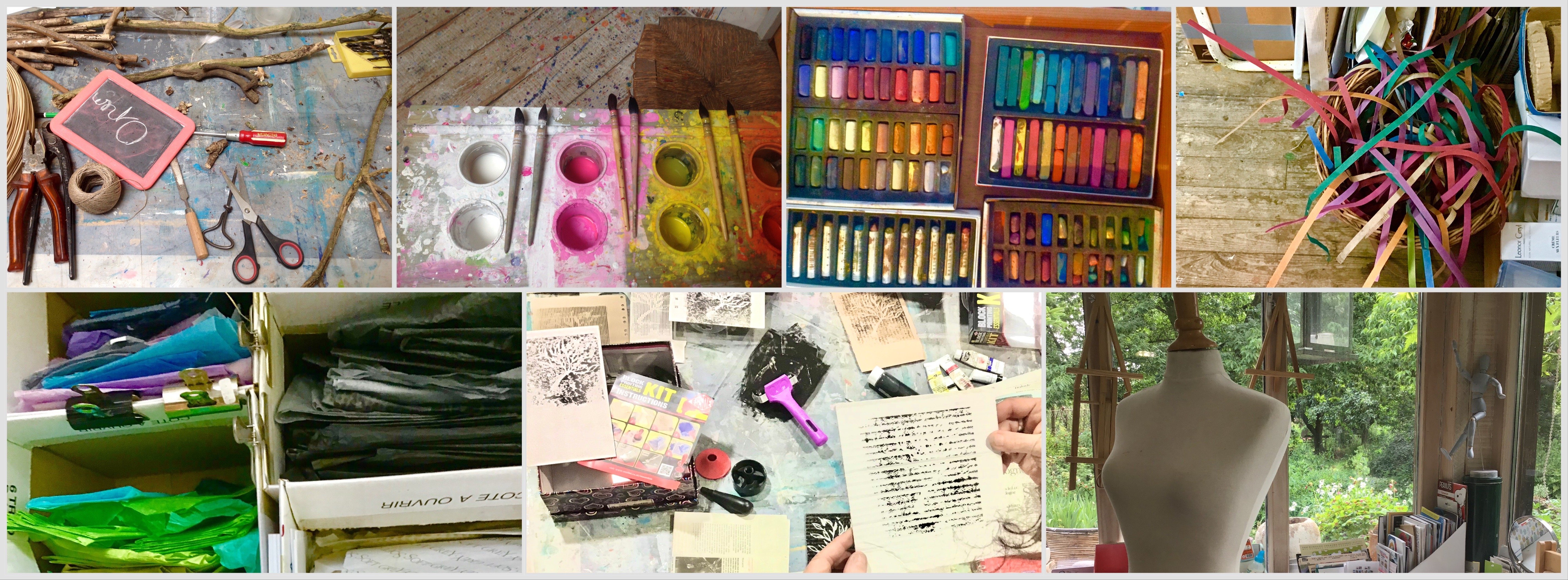 Ainsi pinceaux, plumes, ciseaux, bois, papiers, toiles, tissus, peintures, pastels, encres, argiles, outils,…. sont ils à disposition en toute liberté dans l’Atelier